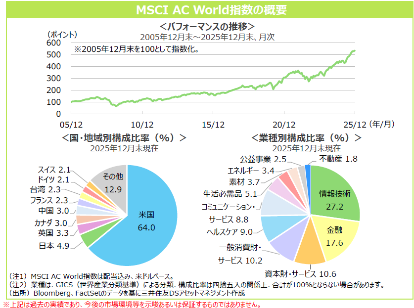 MSCI AC World指数(MSCI オール・カントリー・ワールド指数)は米MSCI社が算出する株価指数で世界の株式時価総額の約85%をカバー(2025年12月末現在)しています。