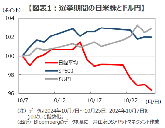 ■「異様な10月相場」は、海外の株式市場や為替市場を確認することで更に際立ちます。今回の選挙期間中、米S&P500種指数は約2%上昇し(10月7日~10月24日)、ドル円は4円16銭の円安となっています(10月8日~10月25日)。通常、米国株が上昇し、更に為替が円安に傾く場合、日本株は上昇することがほとんどですから、10月の日本株の下落がいかに「異様」であったか、容易に想像がつくでしょう(図表1)。