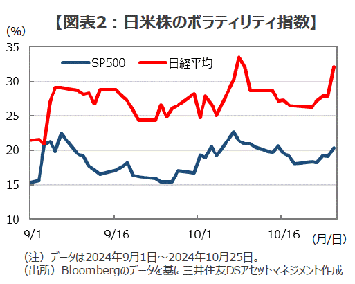 ■マーケットの「嫌な雰囲気」は、オプション市場でも確認することができます。選挙期間中のオプション市場が織り込む日経平均の変動率(日経ボラティリティ指数)は、米国株の変動率(VIX指数)と乖離して大きく上昇していました。つまり、オプション市場の一部の参加者は、日本株の「波乱」を読んで「相場に激震が走ると儲かる取引」を積み上げていた可能性があります(図表2)。