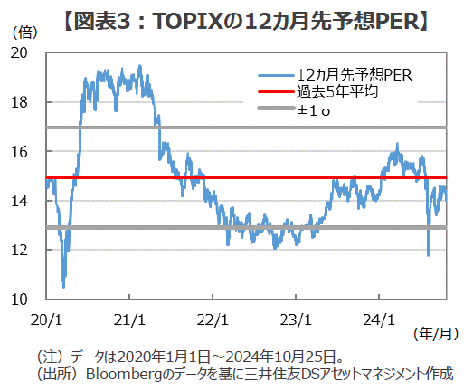 ■日本の企業業績は今年度も堅調な増益が見込まれていますが、今回の選挙結果を受けて急に悪化するものではないでしょう。10月28日のTOPIXは2,605.71ポイントで寄り付きましたが、12カ月先予想PERは約14.0倍となり、過去5年の平均値の約14.9倍を下回っています。また、経験則では12カ月先予想PERの12倍台は底値圏と考えられることから、足元の株価水準は相応に「政治リスクを織り込んだ水準」と言えそうです(図表3)。