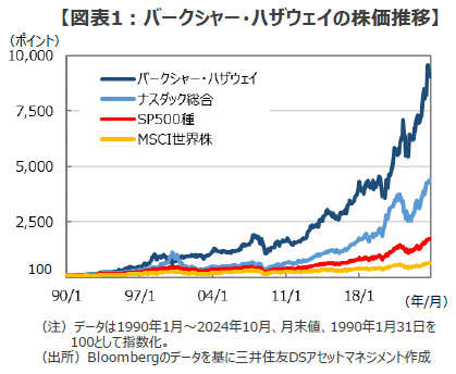 ■米国の著名投資家ウォーレン・バフェットは1930年生まれの94歳で、自身の経営する投資会社バークシャー・ハザウェイを通じて株式投資を行っています。バフェット氏が注目される最大の理由は、抜群の投資パフォーマンスにあります。1990年1月末~2024年10月末までの期間でみると、バークシャー・ハザウェイ社の株価は約90倍に上昇しています。この間、MSCI世界株指数は約6.3倍、S&P500種指数は約17.3倍、ナスダック総合指数が約43.5倍の上昇となっており、バフェット氏の投資パフォーマンスの凄さが分かります