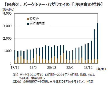 ■そんなオマハの賢人は、足元でどんな投資行動をとっているのでしょうか。バークシャー・ハザウェイ社の2024年7-9月期決算を確認すると、株式ポートフォリオの簿価残高は前四半期比約▲104億ドル減の約781億ドル(約12兆円、以下1ドル=154円換算、除く鉄道、公益、エネルギー事業)となる一方、手元資金(現預金と米短期国債の合計)の9月末残高は約3,203億ドル(約49.3兆円)となっており、前四半期末に比べて約18%の増加、前年同期比で約2.1倍に急増しています(図表2)。