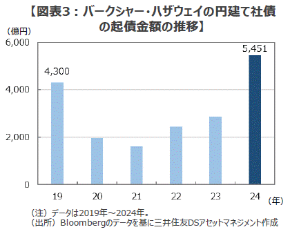 ■バフェット氏が伊藤忠商事、三菱商事、三井物産、住友商事、丸紅の株式を保有していることは広く知られていますが、今後もこうした日本の総合商社や、新たな日本の個別株に更に投資を振り向けてくる可能性が高そうです。というのも、バフェット氏は主に円建て社債の発行により調達した資金で日本株を購入すると明言していますが、2024年には過去最大となる約5,451億円を円建て社債で調達しているからです(図表3)。