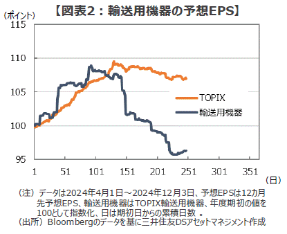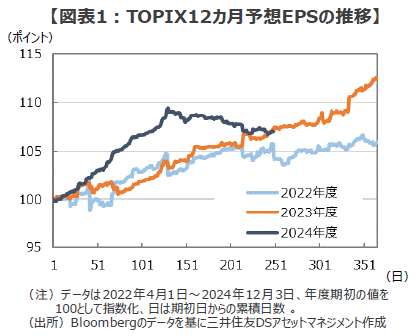 ■一方、株価が大きく上昇した2023年度を見ると、12カ月先予想EPSは年度末にかけて加速しつつ、上昇が続いています。そして2024年度の予想EPSは、春先は昨年度と比べても好調な推移を見せていましたが、株価が伸び悩んだ夏場以降は急ブレーキがかかっていることが確認できます(図表1)。