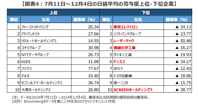 ■7月11日に日本株が高値を付けて以降、日経平均の頭を抑えてきたのは半導体関連株の不調です。7月11日から12月4日までの日経平均の個別銘柄寄与度を見ると、半導体関連株が下位10社のうち実に5社を占めています(東京エレクトロン、レーザーテック、信越化学工業、ディスコ、SCREENホールディングス、図表4)。