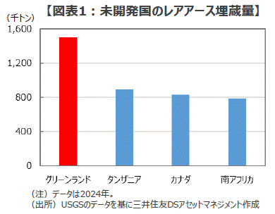 ■そうしたグリーンランドの経済的な重要性が、北極海の水温上昇と氷解により高まっています。というのも、豊富な地下資源で知られるグリーンランドには、大規模なレアアースの鉱床があるからです。その埋蔵量は米国地質調査所(USGS)によれば約1,500千トンに達し、現在確認されている未開発地域としては世界最大となっています(図表1)。
