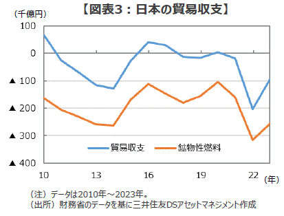 ■例えば、米国は資源エネルギーの開発とその輸出を積極化させつつありますが、一方の日本はエネルギーの約9割を輸入に頼る資源小国です。そして、東日本大震災後の原発の稼働停止や世界的なエネルギー価格の高騰による鉱物性燃料への支払い増加が、昨今の貿易赤字の主因となっています(図表3)。