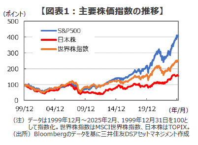 ■米国株投資が人気です。特に、2024年1月の新NISA開始以降、積立投資に米国株を活用する方が大きく増えているようです。こうした人気の背景には、米国株の圧倒的なパフォーマンスがありそうです。米国の代表的な株価指数であるS&P500のパフォーマンスを振り返ると、日本株は勿論、人気の世界株指数を大きく上回る実績を上げています(図表1)。