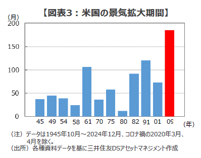 ■米国経済はコロナのパンデミックで2020年3、4月に一時的にマイナス成長となった時期を除くと、2009年6月以降、実に15年以上(185カ月、2024年12月時点)にわたり景気拡大が続いています。ちなみに、これだけ長い期間景気拡大が続くのは、第2次世界大戦以降初めてのことになります。