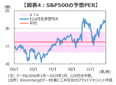 ■S&P500の12カ月先予想株価収益率(PER)は今年2月28日時点で約21.7倍まで拡大しており、2006年1月以降の平均値である約16.2倍を大きく上回っています。ちなみに、この間の予想PERの標準偏差は約3.0のため、足元のバリュエーションは平均値から1標準偏差(生起確率約68%、予想PERで19.2倍)を超えて割高な水準にあることになります(図表4)。