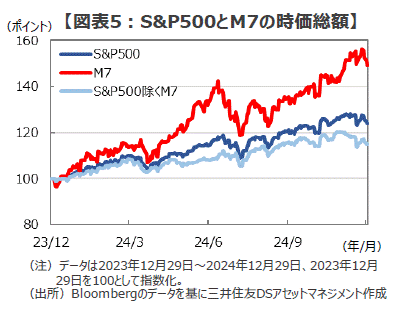 ■こうした相場の過熱感の背景に、マグニフィセント7(M7:アルファベット、アップル、メタ・プラットフォームズ、アマゾン・ドット・コム、マイクロソフト、エヌビディア、テスラの7社)に代表される大手ハイテク株への物色の集中があります。世界を席巻するM7の人気はすさまじく、S&P500に占める時価総額ウエイトは2000年の約16.2%から2024年末には約31.7%まで上昇しています。また、2024年の1年間に、S&P500の時価総額は約24%増加しましたが、M7の時価総額は約49%も増加しています。そして、S&P500からM7を除いた残り493銘柄の時価総額合計は、約15%の増加に留まっています(図表5)。