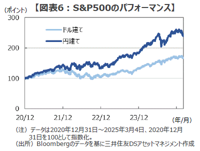 ■S&P500の人気の背景には良好なパフォーマンスがありますが、2020年末以降の円建て及び、ドル建てのパフォーマンスを比較すると、円建てが約+139%に達する一方、ドル建ては同約+66%に留まっています。つまり、日本人がこの数年見てきたS&P500の好調なリターンは、円安により嵩上げされた「追い風参考記録」とすることができそうです(図表6)。