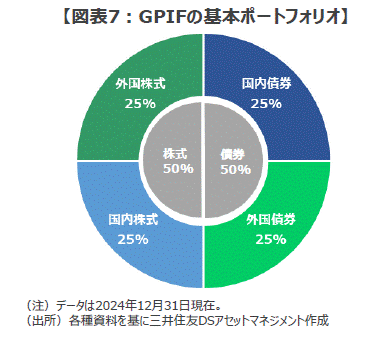 ■巨額の資金を運用する機関投資家は、長期的に有利な資産運用を行うため、決して相場で一点張りするようなことはしません。例えば、私たちの厚生年金や国民年金を運用する年金積立金管理運用独立行政法人(GPIF)は、国内株、外国株、国内債券、外国債券にそれぞれ25%ずつ資金を振り分けるポートフォリオを組んで「分散投資」を実践しています(図表7)。