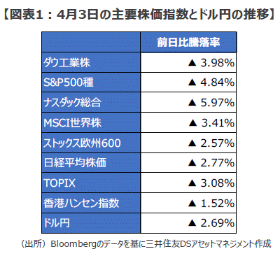 トランプ大統領は4月2日(日本時間4月3日未明)、米ホワイトハウスの中庭にあるローズガーデンで講演し、トランプ関税の詳細を公表しました。市場では関税措置について比較的穏当なものに留まるとの見方が大勢でしたが、予想外に厳しい相互関税の発表にネガティブな驚きが広がり、世界の金融市場に激震が走る事となりました。