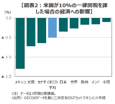 ■相互関税の発表を受けて米国に対する売りが広がったのは、一連のトランプ関税がそのまま実行に移された場合、メキシコのような例外を除けば米国経済が最も大きい影響を受ける可能性が指摘されているからです。経済協力開発機構(OECD)の試算によれば、米国が一律10%の追加関税を世界各国に課した場合、世界経済全体に及ぼす影響は3年間の累積で▲0.27%、OECD加盟国平均で▲0.50%、EU▲0.17%、日本▲0.35%、中国▲0.1%のそれぞれマイナス寄与となる一方、米国経済については▲0.72%の下押し要因になると予想されています(図表2)。