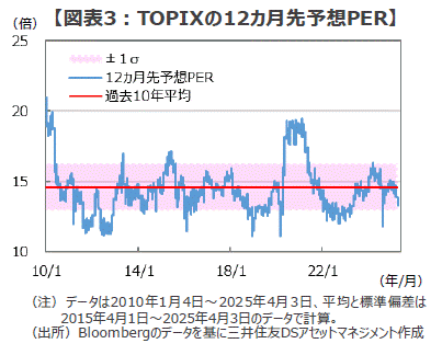 ■4月3日の株式市場の調整を受けて、TOPIXの12カ月先予想株価収益率(PER)は約13.3倍まで低下して、過去10年の平均値である約14.6倍を大きく下回っています。ちなみに、過去のマーケットを振り返るとTOPIXの12カ月先予想PERは12倍台が底値圏となっており、バリュエーション面から見た日本株の下落余地はかなり限定的に思われます(図表3)。もし、ベッセント財務長官が言うように今回発表された税率が「関税の上限」となるのであれば、現在の日本株は関税にまつわる「最悪シナリオ」をかなりの程度織り込んだ、ポジティブなニュースフローに反応しやすい状況にあるのではないでしょうか。