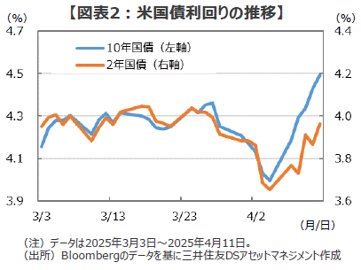 ■今回の債券市場の急変と米国側の対応を見て改めて認識させられたのは、トランプ政権は、①国益を犠牲にしてまで関税政策に固執することはしないこと、②中国の抑え込みが国家としての最優先課題であること、そして、ディールを通じて③同盟国と連携を図りながら中国の封じ込め策を推進していく、といったところではないでしょうか。
