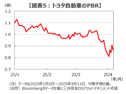 ■昨今の東京証券取引所による株価純資産倍率(PBR)改革を通じて東証株価指数(TOPIX)のPBRは上昇傾向にありましたが、今回の市場の調整で1.1倍台まで低下しています。そして、自動車関税の行方に気をもむ株式市場の不安を映して、日本を代表する自動車会社であるトヨタ自動車のPBRは再び1倍を割り込んでいます(図表5)。