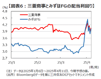 ■個別銘柄を見ても、例えば、先月バフェット氏が追加投資を明らかにした三菱商事の配当利回りは、ここもとの株価の調整で一時約4.3%まで上昇しました。また、日本の金利上昇が追い風となるみずほFGの配当利回りも、一時約4.4%を超える水準まで上昇しています(図表6)。こうした高い配当利回りについて、市場で吹き荒れる嵐が過ぎ去った後に「あの時の株価はおかしかった」と振り返ることになるかもしれません。