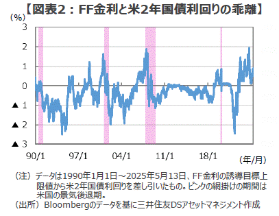 ■パウエル議長がタカ派姿勢を鮮明にしたことに、驚いた市場関係者も少なくないでしょう。というのも、①FRBが最も重視するインフレ指標の一つである3月のコア個人消費支出(PCE)価格指数は5年ぶりの低水準となる前月比±0%まで減速して、インフレは落ち着きを見せています(図表1)。また、②経済学の一般的な考えとして、米国のような大国が課す関税は普通の国と比べて物価に与える影響が限定的とされています。さらに、③消費税や関税によるインフレの押し上げ効果は一時的で基調的なインフレを変化させることは稀ですし、④ベッセント財務長官も指摘するように、足元で政策金利であるフェデラル・ファンド(FF)金利は米2年国債利回りを大きく上回る「金融引締め状態にある」からです(図表2)。