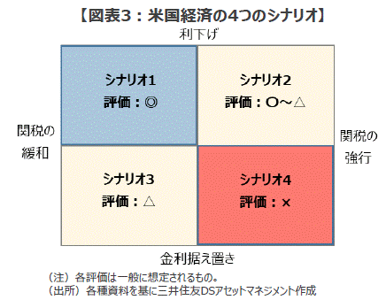 ■現在の状況でパウエル議長が取りうる金融政策の選択肢は、余程の事態を除けば「利下げ」と「金利据え置き」の2択になります。一方のトランプ大統領は、「関税の強行」と「関税の緩和」の2択になります。こうした二人が持つ2つの選択肢の組合せにより、今後の展開は次の4つのシナリオに分類することができます(図表3)。