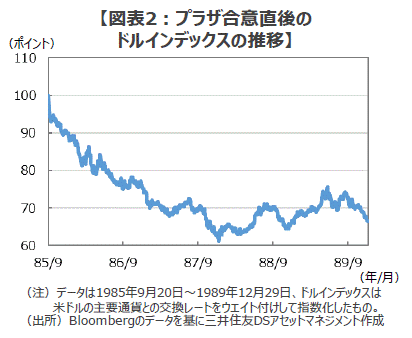 ■こうした点を押さえていれば、最近、市場関係者の間で度々取りざたされる「マールアラーゴ合意」や「プラザ合意2.0」といった、大幅なドル高是正のための国際協調は、「よくできたナラティブ(Narrative、物語、フィクションのこと)」に過ぎないことが分かってきます。なぜなら、1985年9月に結ばれたプラザ合意(1.0?)では、国際協調によるドル安誘導の結果、主要通貨に対する米ドルの価値を指数化したドルインデックスで見た貿易相手国の通貨価値は、1年後の1986年9月には約31%、そして、約2年3カ月後の1987年末には約64%上昇しました。