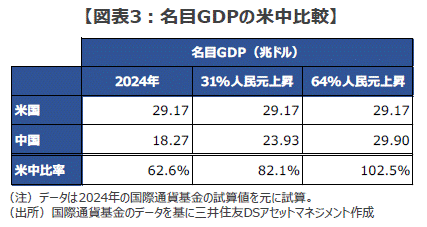 ■現在、中国の名目GDPは約18.27兆ドルで、約29.17兆ドルに達する米国の約63%に留まります(2024年の推計値)。しかし、プラザ合意と同様なインパクトのドル安が対人民元で発生すると、1年後に中国のGDPは米国の約82%に、そして2年3カ月後には米国の約103%に達し、米中の名目GDPは逆転することとなります(図表3)。