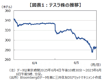 ■二人のこうした対立はメディアで生々しく報じられ、これを受けて6月5日のNY株式市場ではテスラ株が14%下落し、1日で同社の株式時価総額約22兆円が吹き飛ぶこととなりました(図表1)。