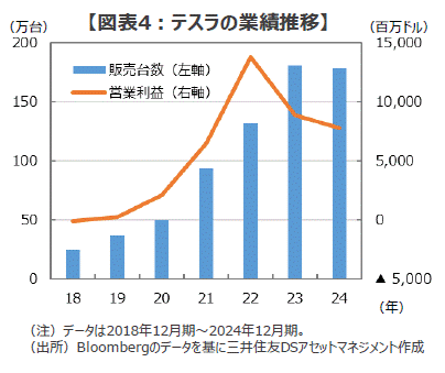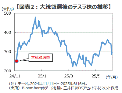 ■大統領選挙での勝利への論功行賞への期待もあって、テスラ株は大統領選挙後の「トランプトレード」で急騰し、一時は大統領選挙前日(2024年11月4日)に比べて約97.6%上昇する時期もありました(図表2)。