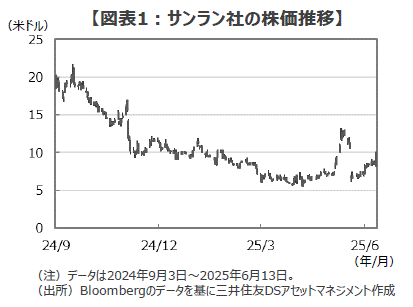 ■そして、5月22日には米下院が再生可能エネルギーへの補助金の廃止を含むトランプ大統領の税制・歳出法案を可決したことを受け、米国の太陽光発電設備大手のサンラン社など関連銘柄の株価は、急落することとなりました(図表1)。こうしたホワイトハウスの政策転換は、テスラ社でEVや太陽光発電を手掛けるイーロン・マスク氏としてもある程度は予想できたとは言え、心中穏やかではいられなかったように思われます。