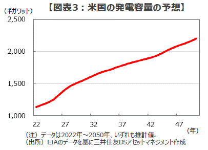 ■現在、米国は電力需要の爆発的な拡大に直面していると伝えられています。米エネルギー情報局(EIA)の長期予測では、米国にある発電所の発電容量は、2022年時点の約1,132.7GW(ギガワット)から2050年には約2,199.3GWへと倍増するものと予測されています(図表3)。