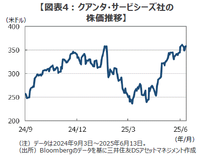 ■このため、今後は積極的な電源開発と歩調を合わせる形で、送電ロスを抑えながら長距離で大量の送電を可能にする「高圧直流送電」や、AIを始めとするハイテクを活用して電力供給を最適化させるスマート・グリッドを活用した「次世代の送電網」の整備・構築が、国家プロジェクトとして動く可能性が高まっています。そして、クアンタ・サービシーズ社のような米国のスマート・グリッド関連銘柄の株価は、ここもと堅調な推移を見せています(図表4)。