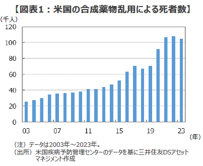 ■この日経報道は、日本政府の関税交渉を難しくする可能性があります。というのも、米国では合成麻薬の乱用が深刻な社会問題となっていて(図表1)、トランプ政権はフェンタニル対策を最重要の政策課題として取り組んでいるからです。そして、米国は合成麻薬の流入を理由に2025年2月には中国に10%、同年3月にはカナダとメキシコに25%の追加関税を発動しています。
