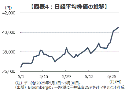 ■26日の日経報道に前後して、日本株の上昇が加速しています。これまで3万8千円台でもみ合っていた日経平均株価は、あっという間に4万円の大台をクリアして大きく上昇しています(図表4)。そんな日本株の突然の上昇に、驚いている方も少なくないでしょう。