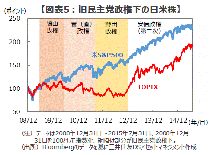 ■例えば、日米関係を重視する第二次安倍政権が2012年12月に発足すると、日経平均株価はわずか2年半の間にほぼ倍に上昇しました。その一方で、時の総理が「日米中は等距離の正三角形の関係」と発言して日米関係がぎくしゃくした旧民主党政権下では、諸外国の株式市場が上昇を続ける中でも日本株は低迷を余儀なくされました(図表5)。