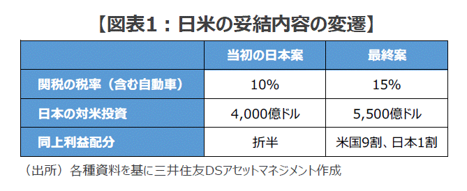 ■日本側は今回の交渉にあたり、①日本に課される関税は10%、②対米投資は4,000億ドル(約58兆円)、③投資リターンは日米で折半、としていたようです。しかし、トランプ大統領との土壇場の交渉で、①関税は10%から15%へ引き上げられ、②対米投資は5,500億ドルに増額され、さらに、③投資リターンの90%は米国に帰属する(The United States will retain 90% of the profits from this investment)という厳しい条件を飲まされることとなりました(図表1)。