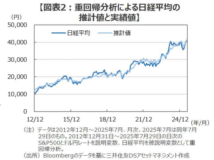 ■2012年末以降の市場データを用いて日経平均株価(日経平均)の動きをS&P500種指数とドル円レートを使って統計的に分析(重回帰)すると、モデルの説明力の強さを示す決定係数(補正R2)は約0.96となり、その動きの実に約96%をS&P500とドル円の変動で説明できることが分かります(図表2)。