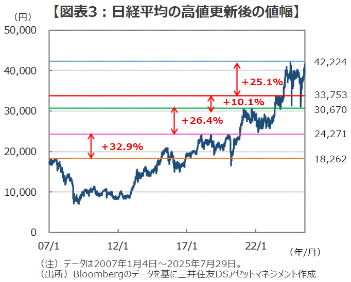 ■仮に、日本株が米国市場に追随して新値を更新していくような「挽回相場」へ移行した場合、どれほどの上昇余地を見ておけば良いのでしょうか。日経平均の過去の値動きを振り返ると、長らく続いた取引レンジの上限が突破された場合、次の上値目途は少なく見積もって約10%、通常なら25%ほど切り上がることが多いようです(図表3)。