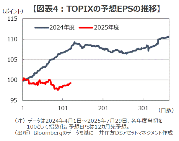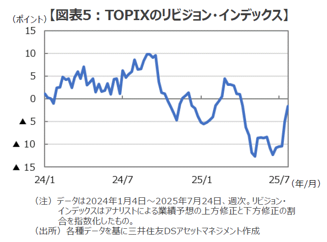 ■こうした強気な数字を見ると、「企業業績が心配」と感じる人も少なくないでしょう。そこで、日本企業の業績予想の動向を見ると、東証株価指数(TOPIX)12カ月先予想一株当たり利益(EPS)は、6月27日を底に徐々に改善傾向に向かいつつあることが確認できます(図表4)。また、アナリストによる業績予想の上方修正と下方修正の割合を指数化したリビジョンインデックスも、足元で急速にマイナス幅が縮小してきています(図表5)。こうした足元の業績修正のトレンドと予想外の低率で妥結した関税交渉の結果を考えると、今後は輸出企業を中心にアナリストの業績予想の上方修正が続く可能性が高まっているように思われます。