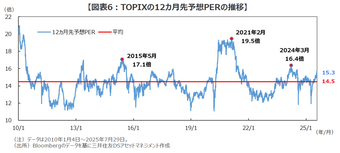 ■次に、現在の日本株の水準を企業業績との見合いで確認してみましょう。代表的なバリュエーション指標であるTOPIXの12カ月先予想株価収益率(PER)を見ると、足元の水準は約15.3倍(7月29日)まで上昇していて、2010年以降の平均値である約14.5倍を上回る水準にあります。こうしたバリュエーション指標を取り上げて「現在の株価は高過ぎる」とする市場参加者も少なくないようです。しかし、長らくレンジ取引が続いた後に相場が上放れる場合、短期的な株価の割高感や過熱感にとらわれていると、相場のトレンド転換や大きな流れに乗り損ねてしまうことが少なくない点には注意が必要でしょう。