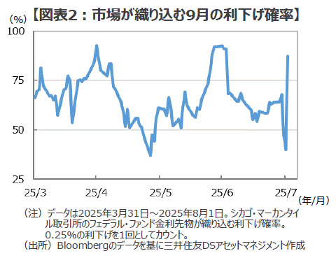 ■とはいえ、今回の雇用統計をきっかけに市場が不安定な動きを見せたとしても、過度な悲観は無用ではないでしょうか。というのも、①FRBが早期に利下げに踏み切る可能性が極めて高いこと(図表2)、②米経済のエンジンである個人消費は依然として堅調なこと、③関税交渉はおおむね穏便な税率で終結しつつあること、④消費を支える所得の伸び(平均時給、7月前年同月比+3.9%)は好調で米国の実質賃金は順調に増加していること、そして、⑤今年後半には10年で総額約4.5兆ドル(約660兆円)のトランプ減税が実施されること、などが米国経済の大幅な減速や市場混乱の長期化の回避に寄与する可能性が高いからです。