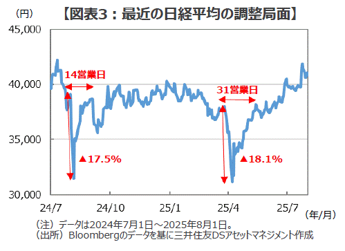 ■このため、米国市場よりも日本の株式市場の調整がより増幅されるリスクがある点には注意が必要でしょう。米国の雇用環境の減速を受けて、短期的に市場はトランプ関税の実体経済への影響を確認する神経質な時間帯が続くものと覚悟しておいた方が良さそうです。とはいえ、中長期の視点に立てば、FRBの利下げや実質所得の上昇を背景とした米国経済の強靭さ、粘り強さを確認することで、株式市場は短期の調整局面の後に長期の上昇軌道に回帰する可能性が高そうです。このため、仮に、株式市場が大幅に調整するようなことがあれば、昨年8月や今年4月と同様に、長期投資家にとっては魅力的な押し目買いの機会となる可能性が高いように思われます(図表3)。