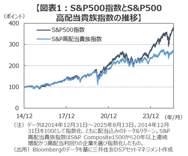 ■例えば、米国の大手ハイテク企業などは配当よりも将来に向けた投資を優先する傾向が強いため、一般に配当利回りは低くなりがちです。一方、業績が伸び悩み将来にむけた有望な成長機会を見いだせない企業は、本業の儲けの多くを配当として払い出すため配当利回りは高くなりがちです。こうした2つの企業を比べた場合、長期的にどちらが投資対象として魅力的かは、配当利回りだけでは決まらないのは言うまでもないでしょう(図表1)。