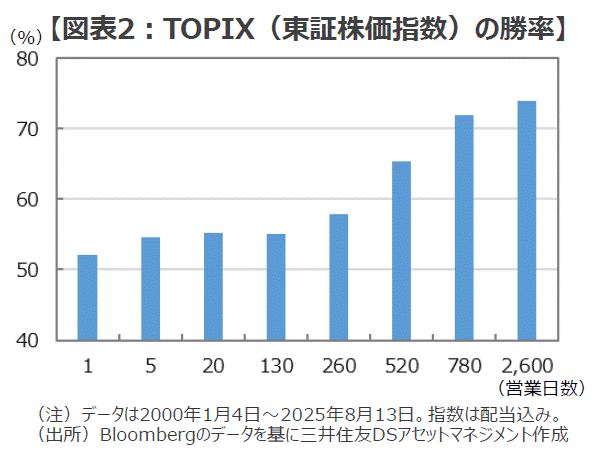 ■先に見たように、株式市場では長く持ち続けることで勝率が上昇して、「投資した意味」が出てきます。つまり、上下に大きく暴れる株式市場の動きを受け流して、一喜一憂せずに市場のリスクを取り続けることが、「敵」を熟知した上で「戦」を有利に進めるポイントと言えそうです。