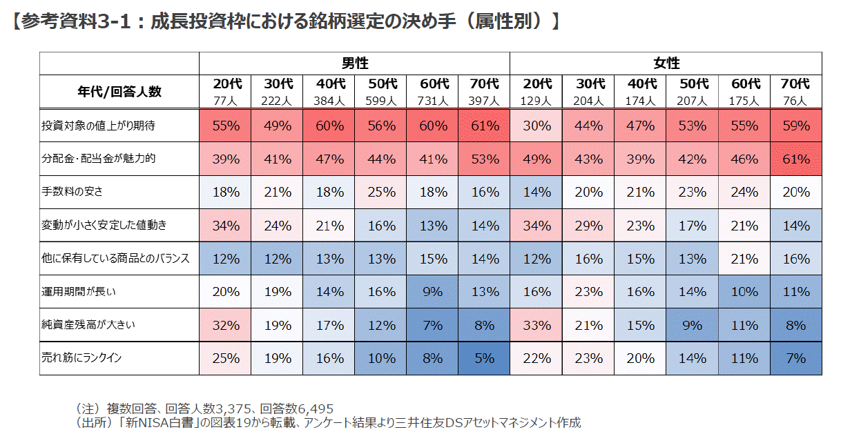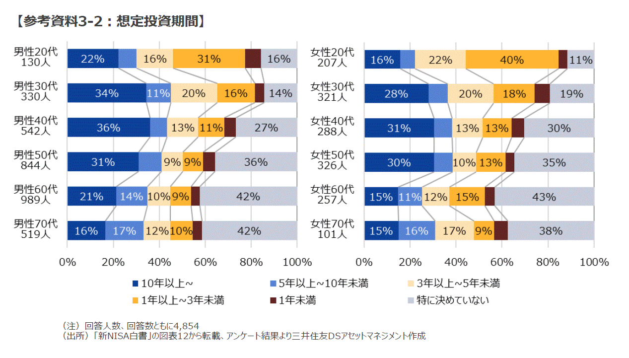 ■新NISAを利用している投資家の年代別の特徴を見ていくと、若い世代ほど「投資の想定期間が短く」、「変動が小さい安定した値動き」を志向する傾向が強いようです。こうした考え方が残念でならないのは、本来なら若い世代ほど年長者よりも平均余命が長いため、投資期間を長くとることが可能なはずだからです。先にも見たようにリスク資産への投資は期間を長くとるほど有利になる傾向があるため、若者ほど長期目線でリスク資産に積極的に投資を行うことで、有利に資産運用を進めることが可能になるはずなのです。