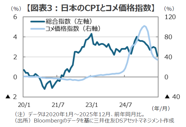 ■足元の経済指標を確認すると、12月の日本のCPIはガソリン補助金の影響もあって前月の+2.9%から+2.1%に急減速しました。また、これまで日本のCPIを大きく引き上げてきた食品、なかでもコメ価格は一部で流通在庫の積み上がりから店頭価格に調整の動きがみられ、12月のCPIのコメ価格指数は前年比で減速傾向が鮮明になっています(図表3)。