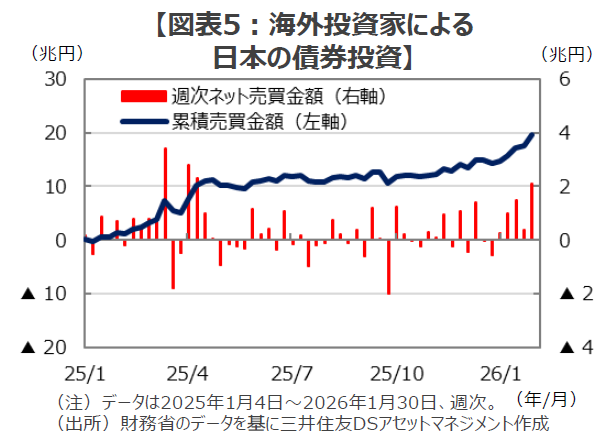 ■財務省が公表した対外・対内証券投資によれば、海外投資家は2026年1月26日の週に国債などの中長期債を約2兆円買い越し、買い越し額としては2025年4月以来約9カ月ぶりの高水準に達したことが伝えられています(図表5)。