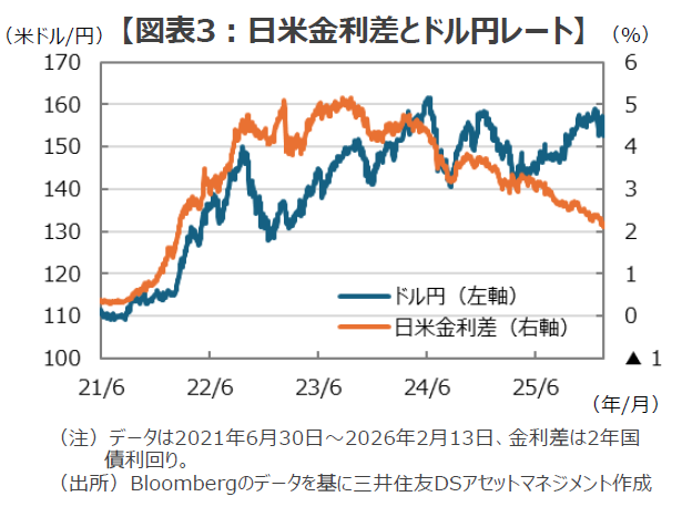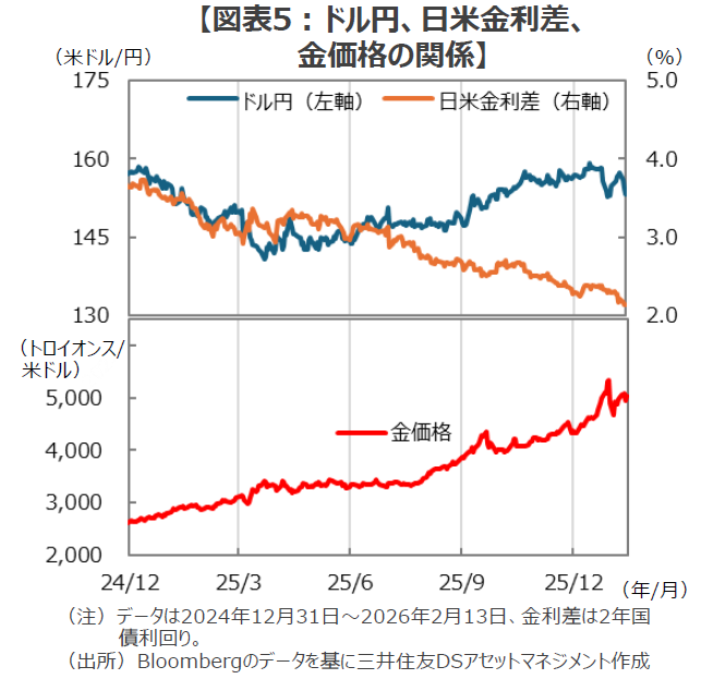 ■2025年の夏以降、日米金利差に逆行する形でドル円は円安が続いていますが、こうしたドル円の不自然な動きは金価格の上昇と逆相関の関係が見て取れます(図表5)。