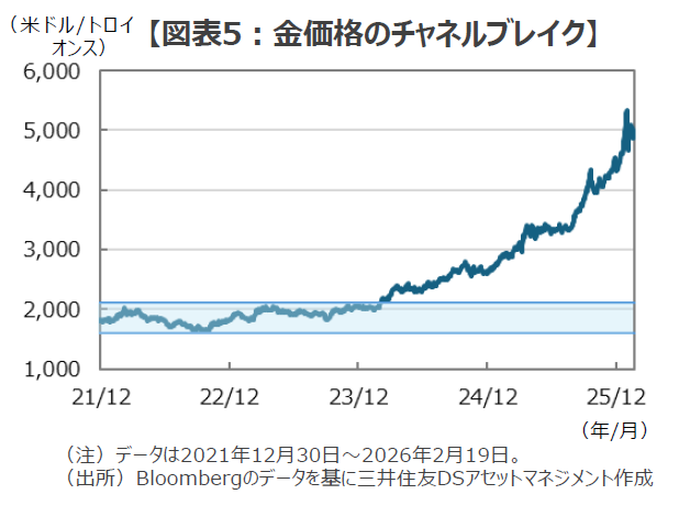 ■ここ数年の世界の金融市場や商品先物市場を振り返ると、金のスポット価格は間違いなく主役の一つとすることができそうです。金価格は2023年8月まで3年以上も1,600~2,100ドルのレンジでの推移が続き、何度も「騙し(抜けそうで抜けずに元のレンジに戻ること)」を繰り返していました。しかし、2024年3月に2,100ドルのレンジ上限を「ブレイクアウト」して力強い上昇トレンドが出現し、その後は押し目らしい押し目を作ることなく上昇を続け、2026年1月末には約2.7倍となる1トロイオンス当たり5,595.47ドルまで上昇しました(図表5)。