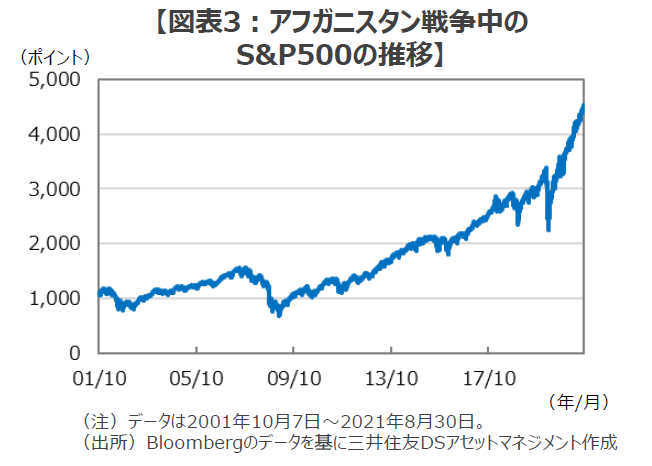 ■米国は有史以来、ほとんどの期間に何らかの戦争を継続しています。このため、アフガニスタン戦争(2001年10月から約20年間)のように長期化・泥沼化しても、同期間にS&P500種指数が約4.2倍に上昇したように(図表3)、「遠い国での戦争」が米国株に長期にわたり影響を与える可能性は限定的と言えそうです。そして、今回のイランとの戦争も米国のファンダメンタルズに若干の影響を与える「数ある地政学リスクの一つ」となっていく可能性が高そうです。